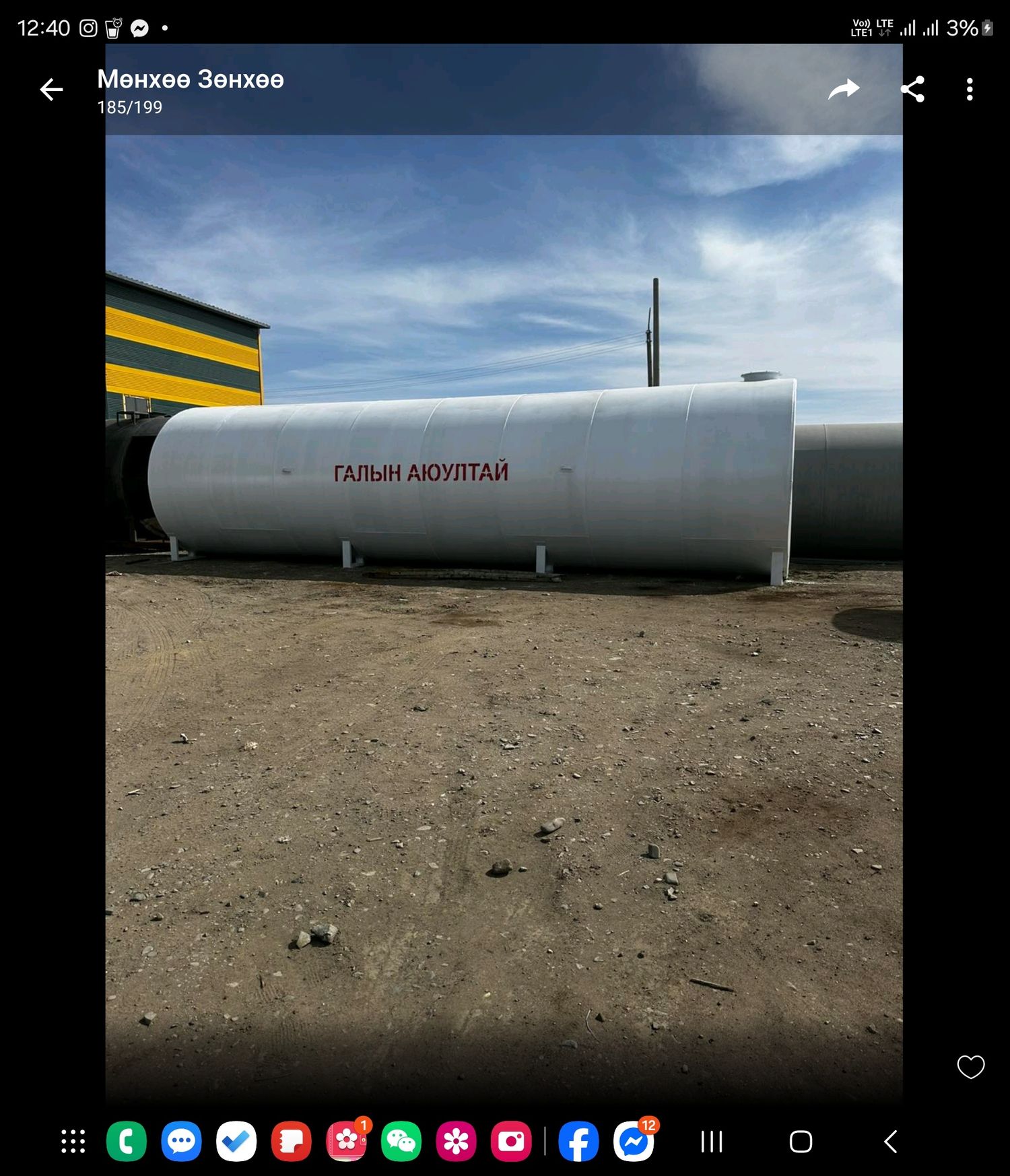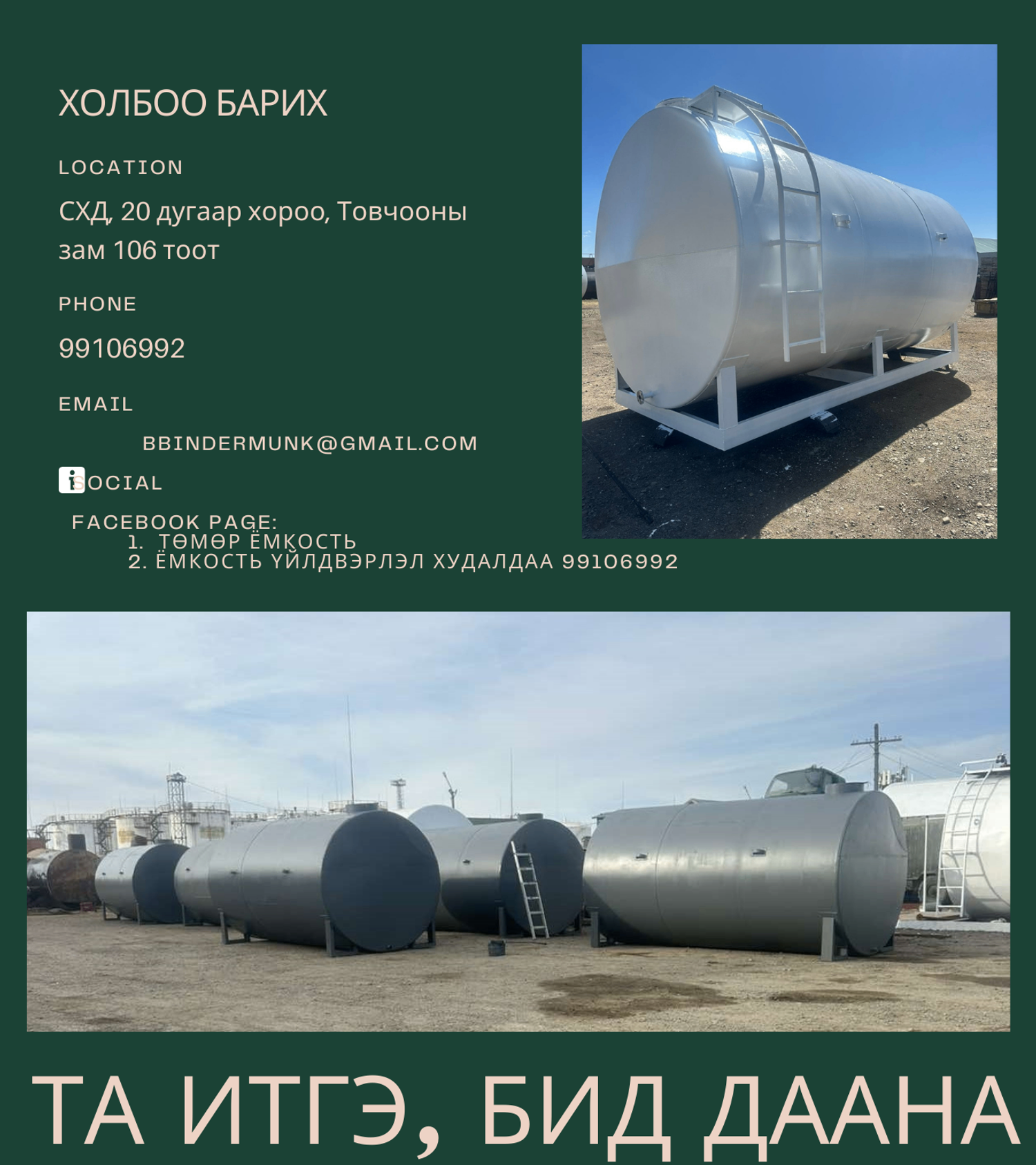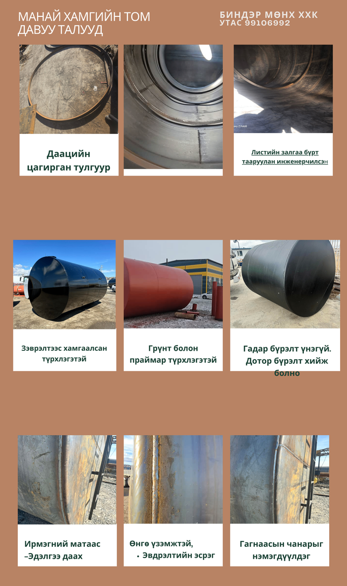 100,000 мкуб хэмжээтэй Ёмкостийг Монголд анх удаа үйлдвэрлэж эхэлсэн бөгөөд олон газарт хийж нийлүүлсэн туршлагатай. Мөн шатах тослох материалын агуулах, хөдөө аж ахуйн салбарт усалгааны болон агуулахын зорилгоор ашиглахад маш "Том" хэмжээтэй тул танай багууллагын үнэтэй Хөрөнгө болно. Зэврэлтээс хамгаалах түрхлэгтэй, захиалагч хүсвэл дотор хэсгийг давхар бүрэх боломжтой. Мөн шат, тулгуур, суурь, хашлага гэх мэт тоноглолуудыг нэмэлтээр хийх боломжтой. Захилга өгвөл 3-5 хоногт хийж өгнө.